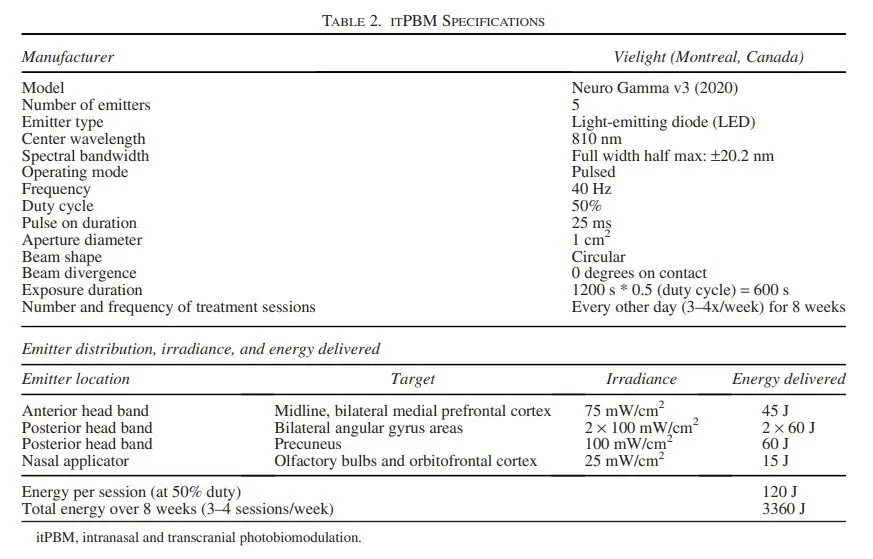 Participants self-administered itPBM using the Vielight Neuro Gamma PBM headset, which has four LEDs emitting NIR light (810 nm) and an intranasal probe emitting pulsed NIR light. Treatments lasted 20 minutes every other day for 8 weeks, with participants tracking usage on a log sheet.