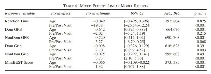 Motor tests were scored according to their standards. Data from participants with limb injuries were excluded. Normality of measurements was evaluated using Shapiro-Wilk tests. Linear mixed-effect analyses, using the maximum likelihood method, assessed motor outcomes with “age” and “visit time” as fixed effects and random intercepts by “participant.” Normality was confirmed through residuals examination. Wilcoxon’s signed-rank test was used for non-normal variables. The Benjamini-Hochberg procedure controlled for multiple comparisons, with a significance threshold of α = 0.05. P values with 95% confidence intervals (CIs) were reported, and effect size was measured by Hedges’ g.